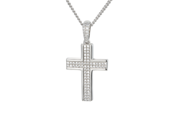 Shine with elegance and faith in this striking cubic zirconia necklace from Amore Argento. The Angelic Cross pendant is crafted from sterling silver and embellished with 74 micro-set round cubic zirconia, creating a sparkling finish that catches the light beautifully.
