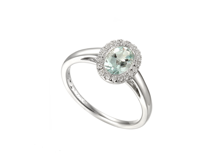Elevate your jewellery collection with this stunning aquamarine ring from Amore Argento. Crafted in sterling silver, the design showcases a 6x4mm oval aquamarine at its centre, framed by a halo of sparkling cubic zirconia that enhances the stone’s Mediterranean blue tones.