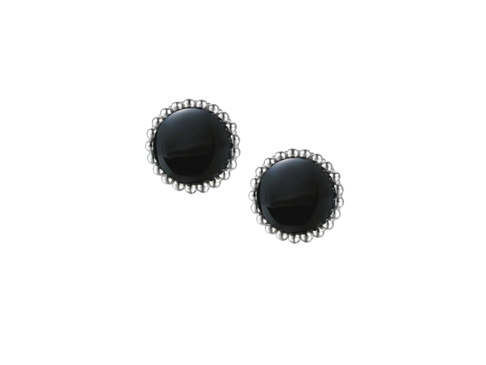 These earrings measure 8mm in diameter and contain a 6mm cabochon black agate.