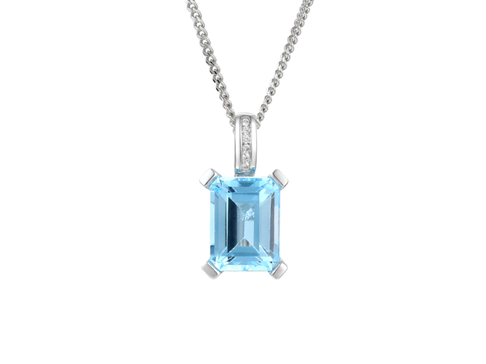 This pendant measures 12x10mm and contains an emerald cut blue topaz.