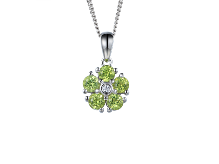 Brighten your look with the natural beauty of this peridot necklace, crafted in sterling silver with a classic daisy-inspired cluster design. Each semi-precious peridot gemstone is paired with sparkling cubic zirconia, creating a fresh, vibrant style that’s perfect for both everyday wear and evening occasions.