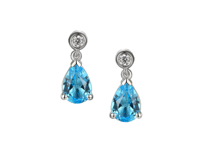 These drop earrings measure 12.5mm long and 5.5mm wide, showcasing pear-shaped blue topaz drops suspended from round cubic zirconia studs.