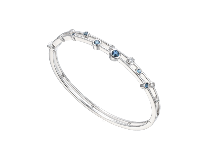 Crafted with a slim profile, this London blue topaz bracelet measures 4mm at the bottom and 6.25mm at the top, giving it a sleek and comfortable fit. Its versatile design makes it ideal for layering with other bangles or wearing solo as a striking statement piece.