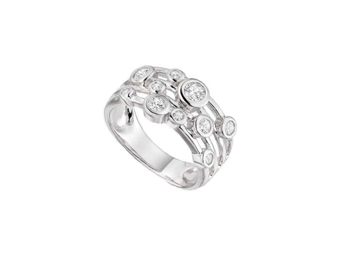 Crafted in sterling silver, this ring measures 6mm wide at the bottom of the shank and graduates to 10mm at the top, ensuring a comfortable fit with a bold, eye-catching presence. The cubic zirconia gemstones are carefully set to maximise sparkle, giving this sterling silver cubic zirconia ring a timeless appeal.