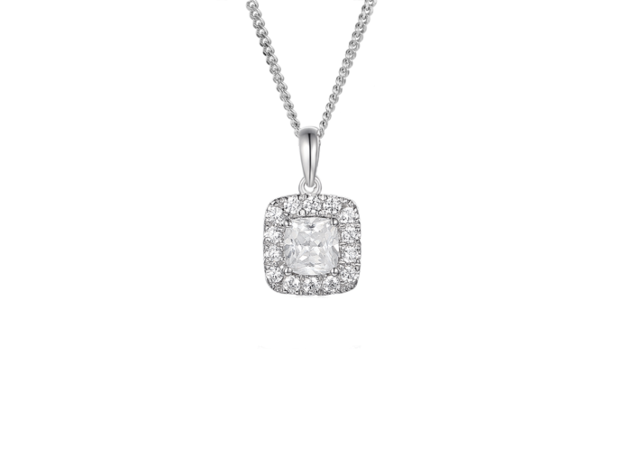 One of our most popular pieces, the Light Fantastic necklace is in the shape of a cushion halo cluster with cubic zirconia at the centre and surround. Our team of designers pulled out all the stops for you when creating this contemporary piece that will catch eyes and turn heads. Complete with an adjustable 16 to 18in silver chain, it’s perfect for day or evening wear and will compliment any outfit. Matching earrings and ring are available to finish your look with absolute style.