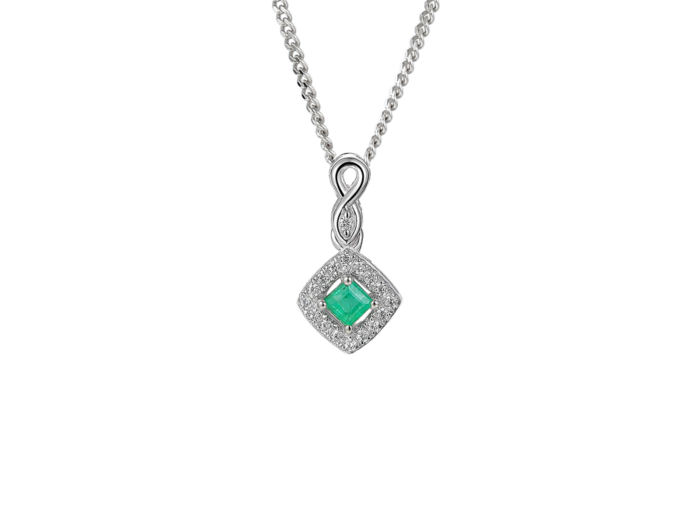 This enchanting pendant necklace showcases a vibrant emerald gemstone, set in sterling silver and surrounded by a dazzling halo of cubic zirconia. The elegant infinity detail above the pendant symbolises eternal beauty and grace, making this piece both stylish and meaningful. As the birthstone for May, emerald is celebrated for its rich green hue and is thought to represent renewal, growth, and wisdom. Complete with an adjustable 16 to 18-inch silver curb chain, this necklace brings a timeless touch of luxury to any ensemble, perfect for special occasions or daily elegance. Matching earrings available.