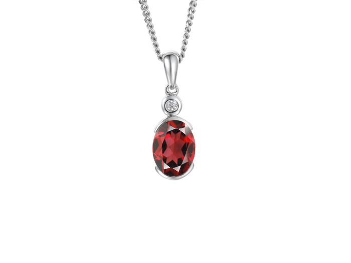 Add sparkle to any outfit with this delicate oval-shaped red garnet pendant with sparkling cubic zirconia. The birthstone of January, love and commitment are the attributes of garnet. Complete with an adjustable silver curb chain of 16in to 18in this elegant necklace with a splash of colour is a joy to the eyes.