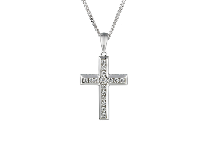 This cross is 30mm high including the loop and 16mm wide with 16 round cubic zirconia set in channels.