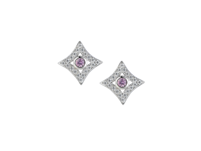 These earrings have a beautiful round Pink Sapphire in the middle, surrounded by sparkling cubic zirconia stones in a star formation. The Pink Sapphire symbolises love, truth and feminine power. Thanks to their durability, meaning and delicate colour, Pink Sapphires are perfect for all jewellery creations. The Amore in-house designers have created these stunning earrings which make you feel like a star and you can match them to the necklace.